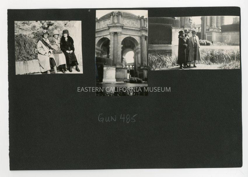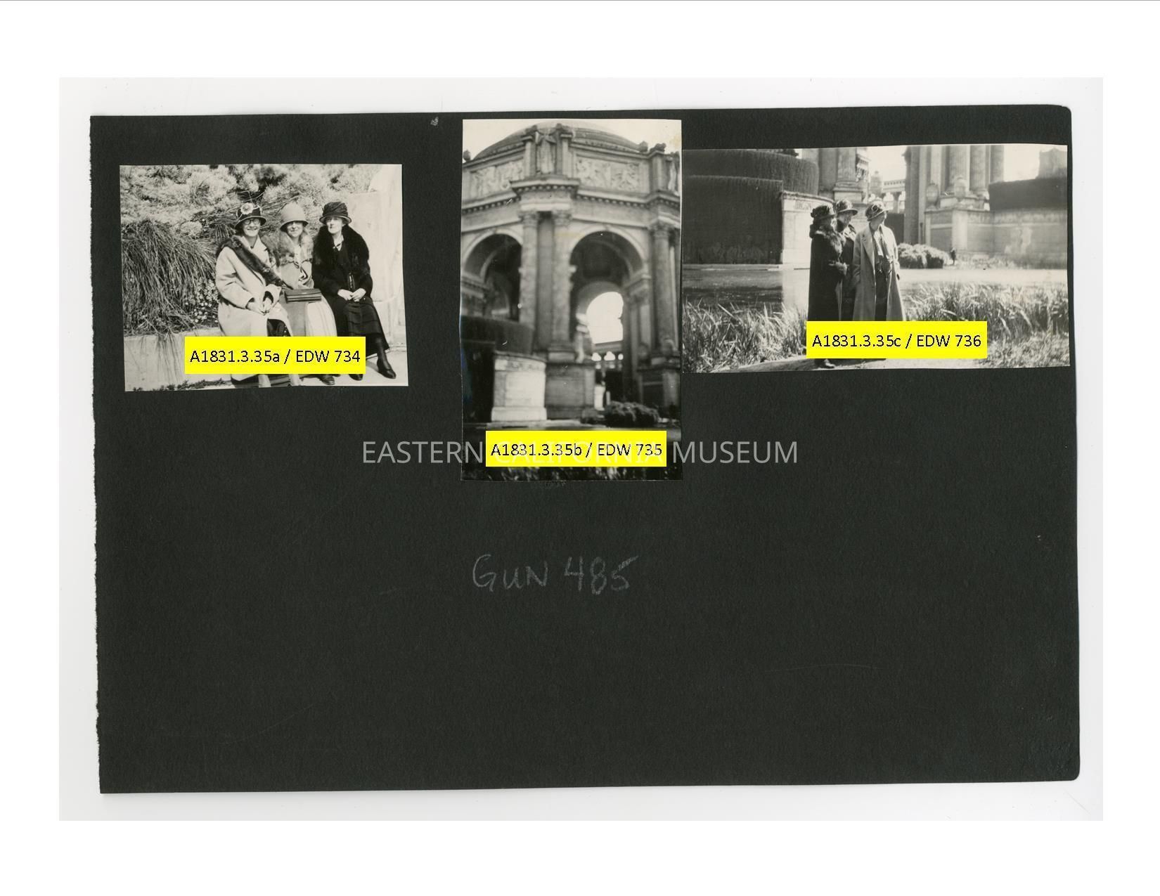 A1831.3.35c: Photo of three women in coats and (cloche?) hats standing in front of a pool or moat with monumental architecture in the background.Collection