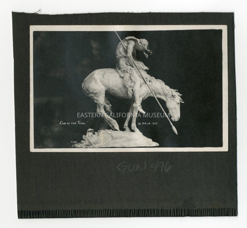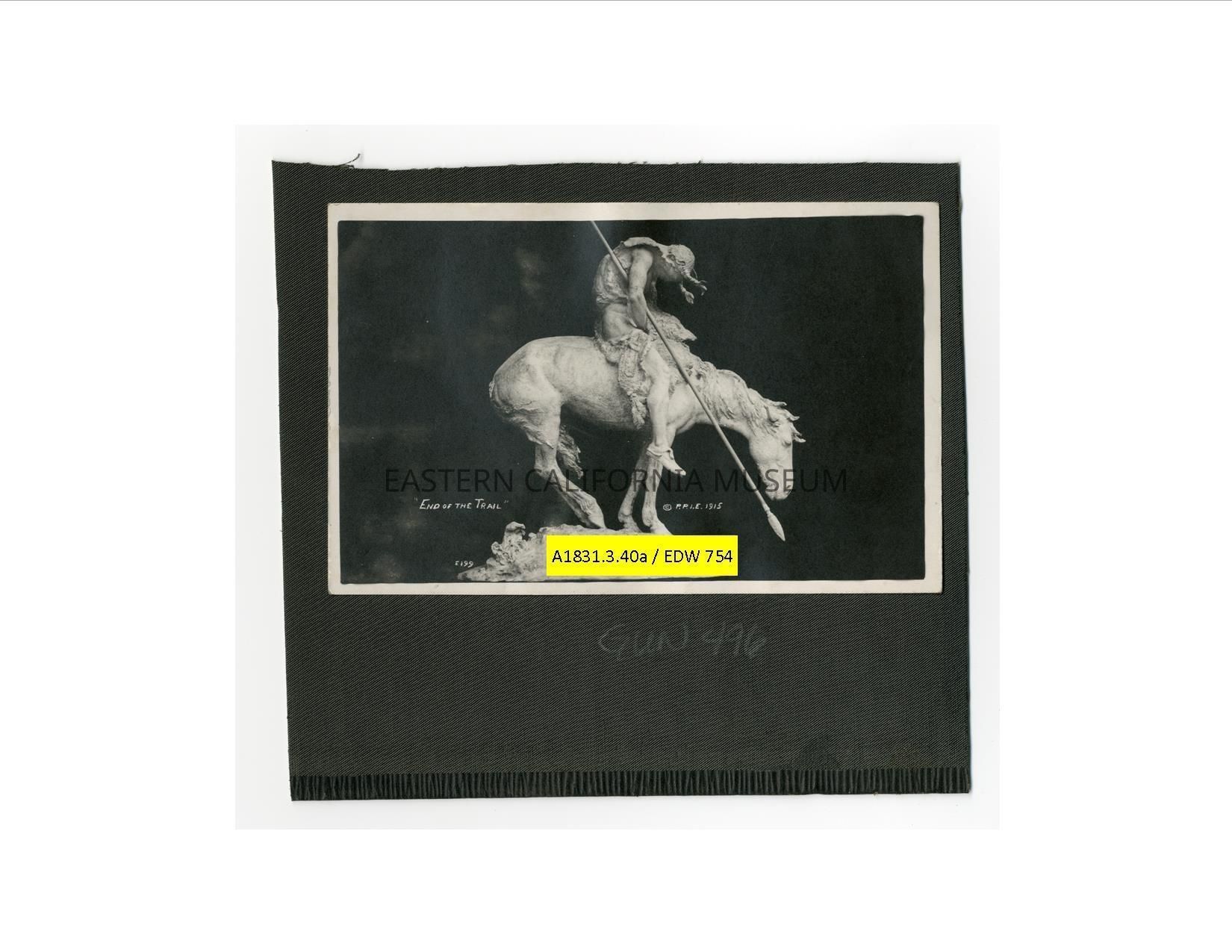A1831.3.40a: Photo of a sculpture titled, "End of the Trail" copyright by P.P. I. E. 1915. It has the photographer's ID #E199.