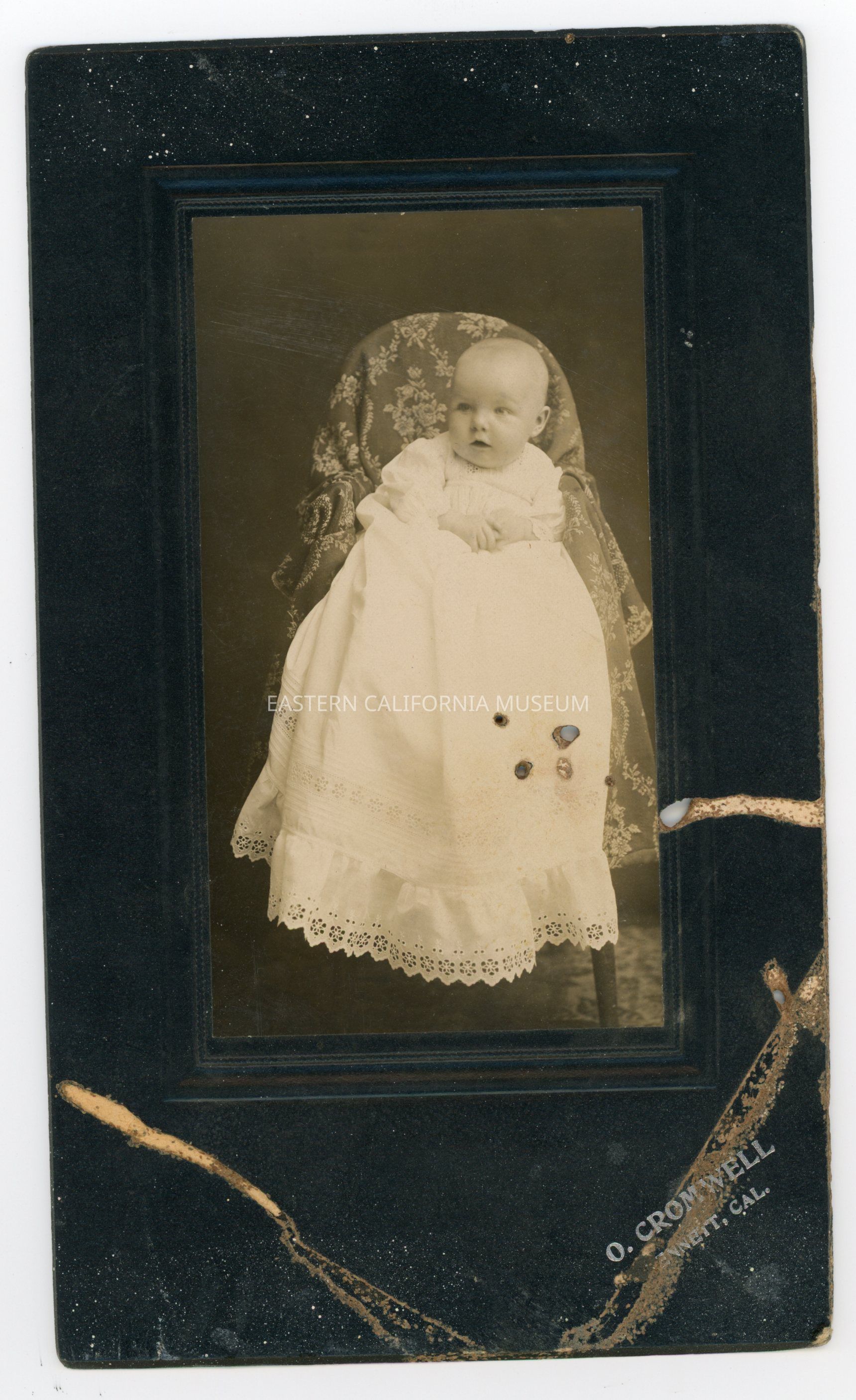 Damaged mounted studio portrait of a baby in a long white gown sitting on a wooden chair that has been draped in floral fabric. Photographer was O. Cromwell of Kennett, Cal.Collection