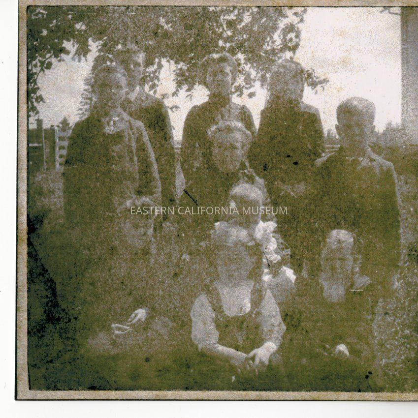 Family photo of the Clyde family. Standing back row, from left to right: Norman, Arthur, Margaret, Mabel, John. Center is Sara Isobel Belle Clyde with baby Grace in lap. Bottom row kneeling or sitting, from left to right: Clara, Sara (daughter), and Eva.Relationships