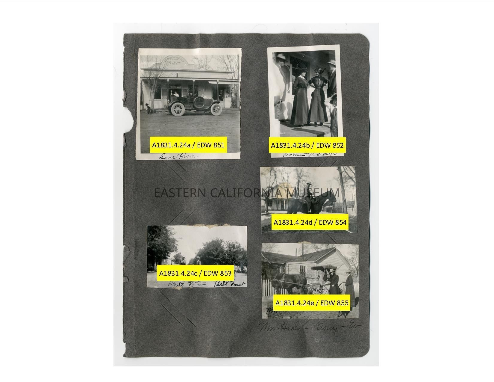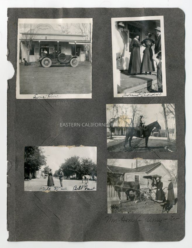 A1831.4.24b: Exterior photo of a group of people standing on the porch of the Carrasco candy and ice cream store in Lone Pine. Two women are the main focus, but there are three men and a young boy also in the photo. They women are identified as Dora and Gladys.