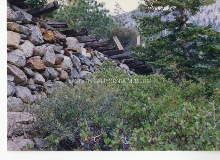 Color. Stone retaining wall and timbers, evidence of the logging operation in the Sawmill Creek area.