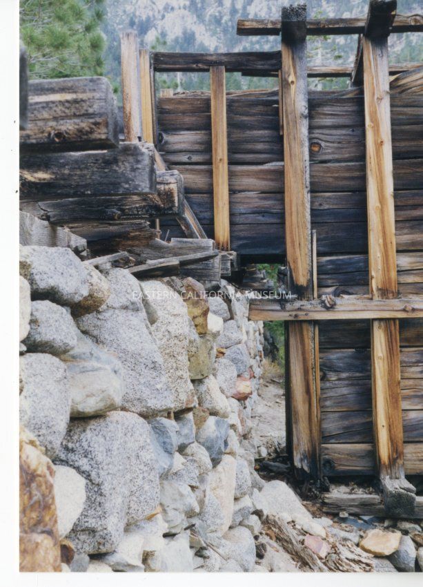 Color. Stone retaining wall and timber wall of a sluice-like (?) structure, evidence of the logging operation in the Sawmill Creek area.