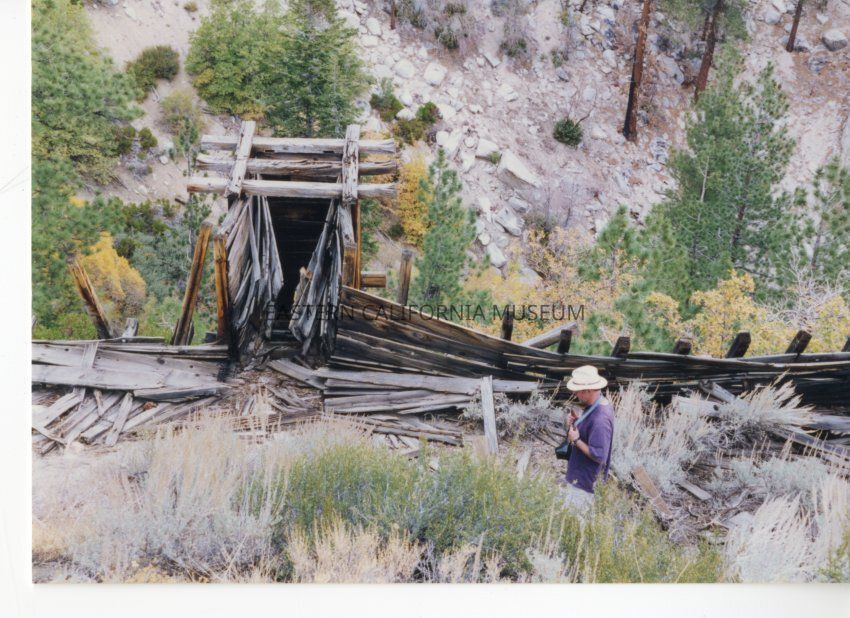 Color. Timber struture, possibly a sluice, and an unidentified male (either Brian Roy or Perry White), evidence of the logging operation in the Sawmill Creek area.Collection