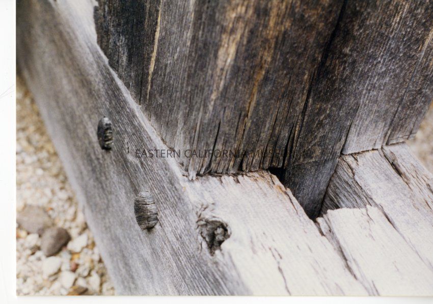 Color. Close up detail shot of a timber struture (forebay/intake structure as identified by Terry Roy) highlighting the joinery, evidence of the logging operation in the Sawmill Creek area.Collection