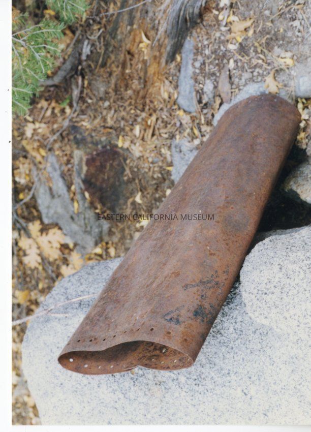 Color. Rusted piece of riveted steel construction pipe that Terry Roy identifies as being part of the penstock, evidence of the logging operation in the Sawmill Creek area.Collection