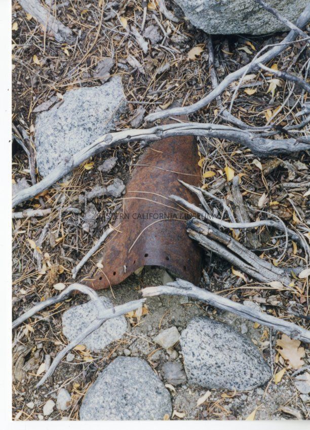 Color. Rusted piece of riveted steel construction pipe that Terry Roy identifies as being part of the penstock, evidence of the logging operation in the Sawmill Creek area.Collection