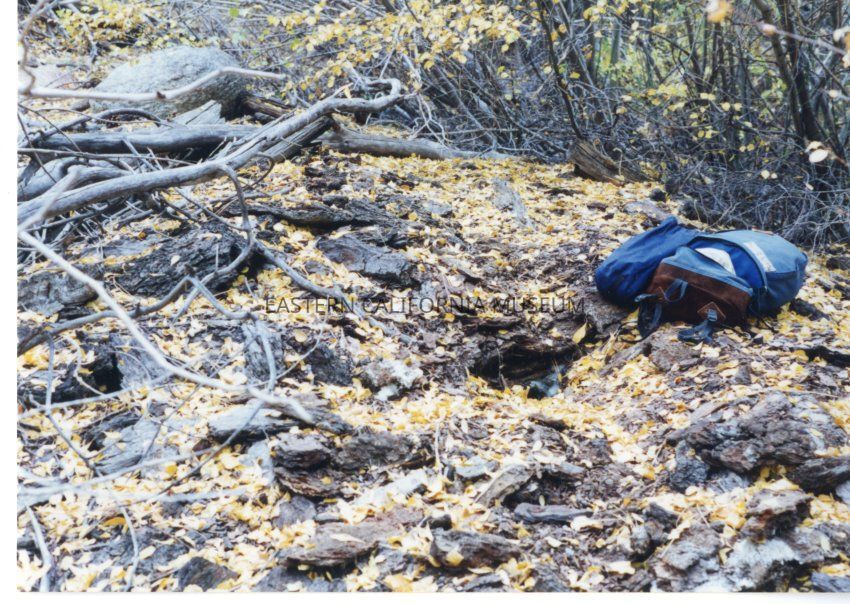 Color. Large mound of sawdust and bark, evidence of the logging operation in the Sawmill Creek area. Also a blue backpack belonging to either the photographer or one of his companions.Collection