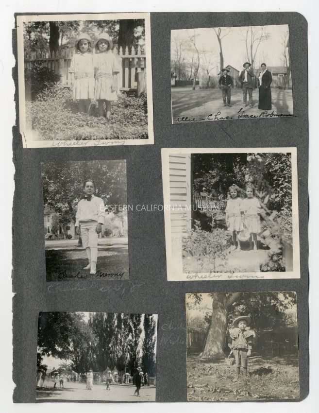 A1831.4.46a: Exterior photo of a pair of twins standing in front of a white picket fence. They are identified as the Wheeler twins.