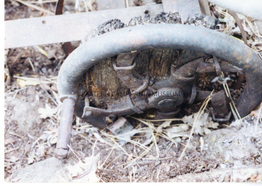 Color. Rusted metal wheel with bolt-like handle, all of which is attached to timber, evidence of the logging operation in the Sawmill Creek area.