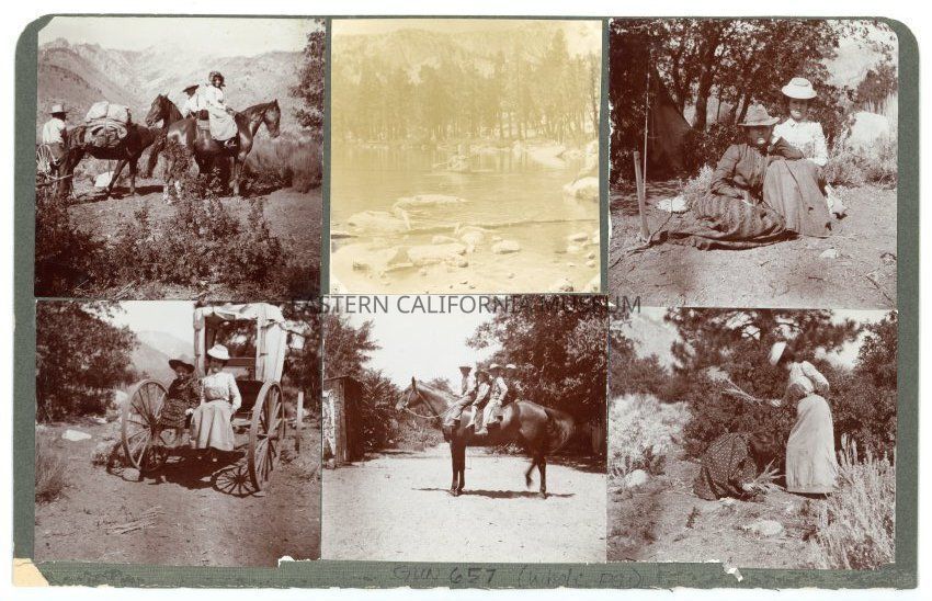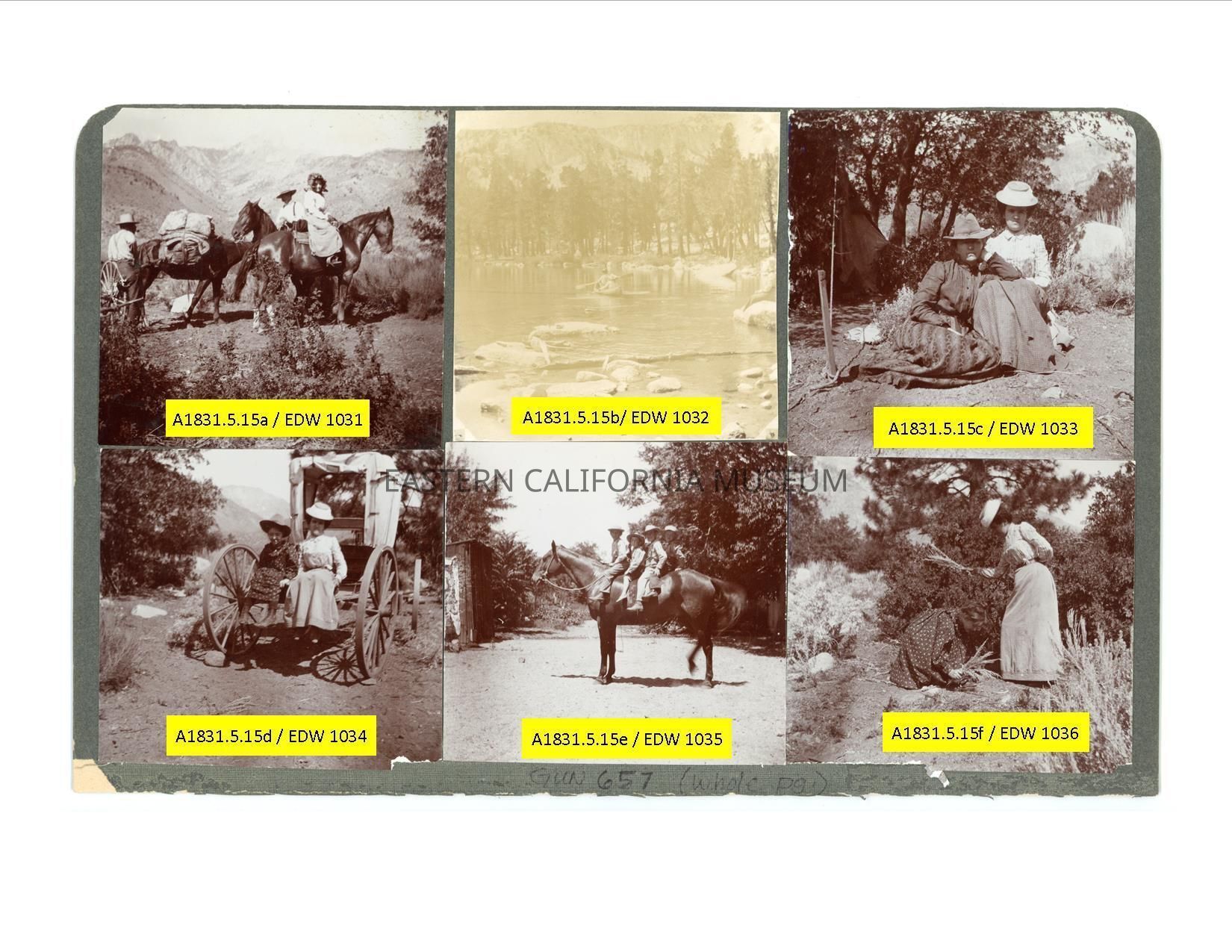 A1831.5.15a: Exterior photo of a young girl mounted on horseback in the mountains. There is a man on horseback behind her, and another man standing by a pack horse/mule. There is a wheel visible near the standing man--maybe a supply wagon? Likely on a camping trip.