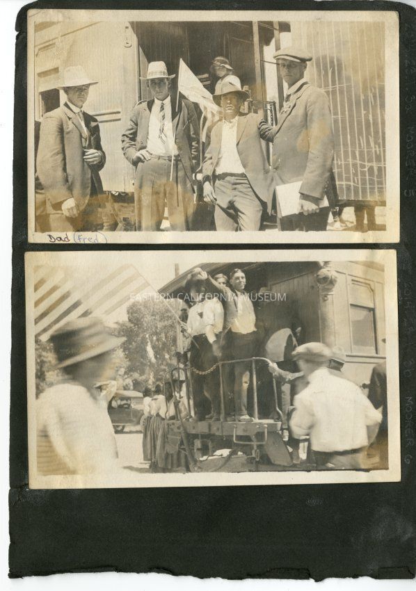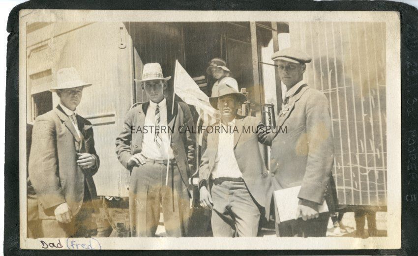 Four men and a girl standing in front of a train. Man on far left is identified as "Dad (Fred)." American flag in center of photo.