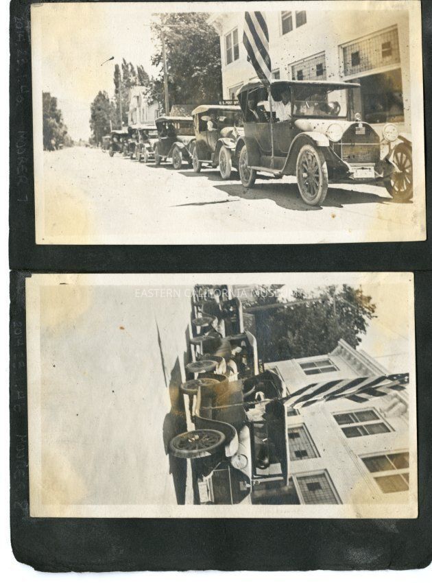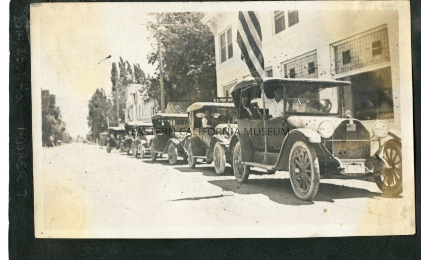 Photo of what might be Bishop Main St. (current Mountain Light Gallery building on corner of Main and Line St.) with line of vehicles. First vehicle has man holding a large American flag out of passenger side. U. S. Post Office sign in background. Same event as photo MOORER 8.Collection