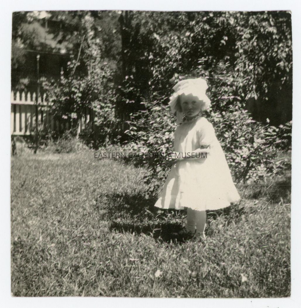 Exterior photo of a toddler standing on a grassy lawn. This photo was loose in photo album A1831.5.