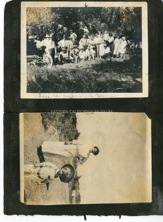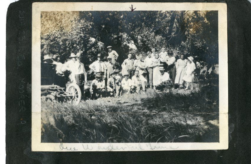 Photo of large group of people. Vehicle and American flag visible in photo. One man has been singled out with an arrow--might be Fredrick Arthur Moore. Photo is labeled in pencil with "--- wonderful time."Collection