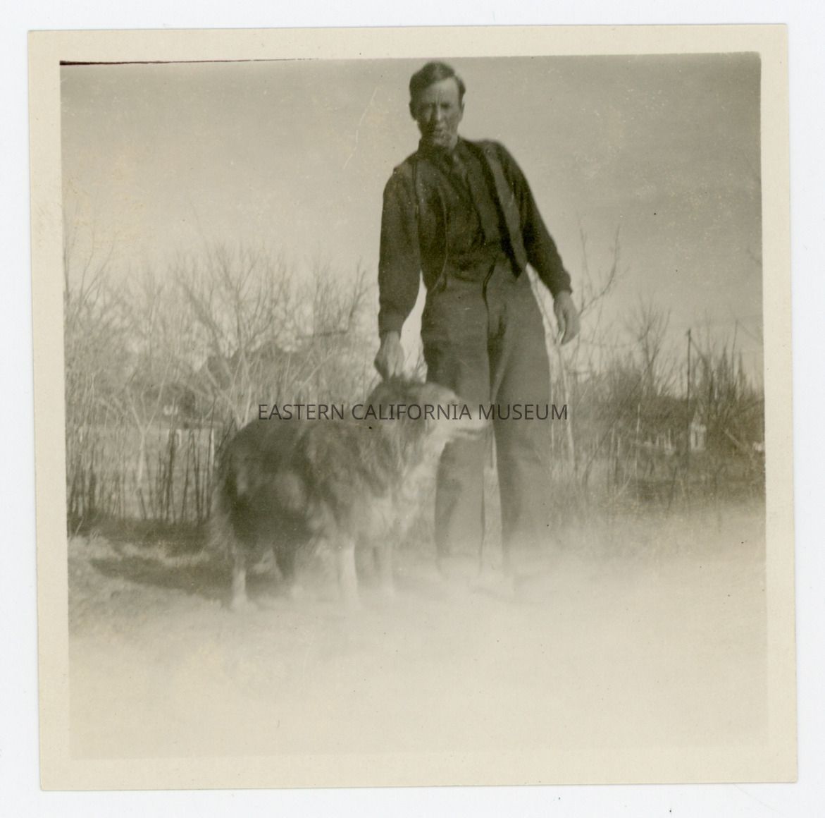 Exterior photo of a man and a dog. This photo was loose in photo album A1831.5.