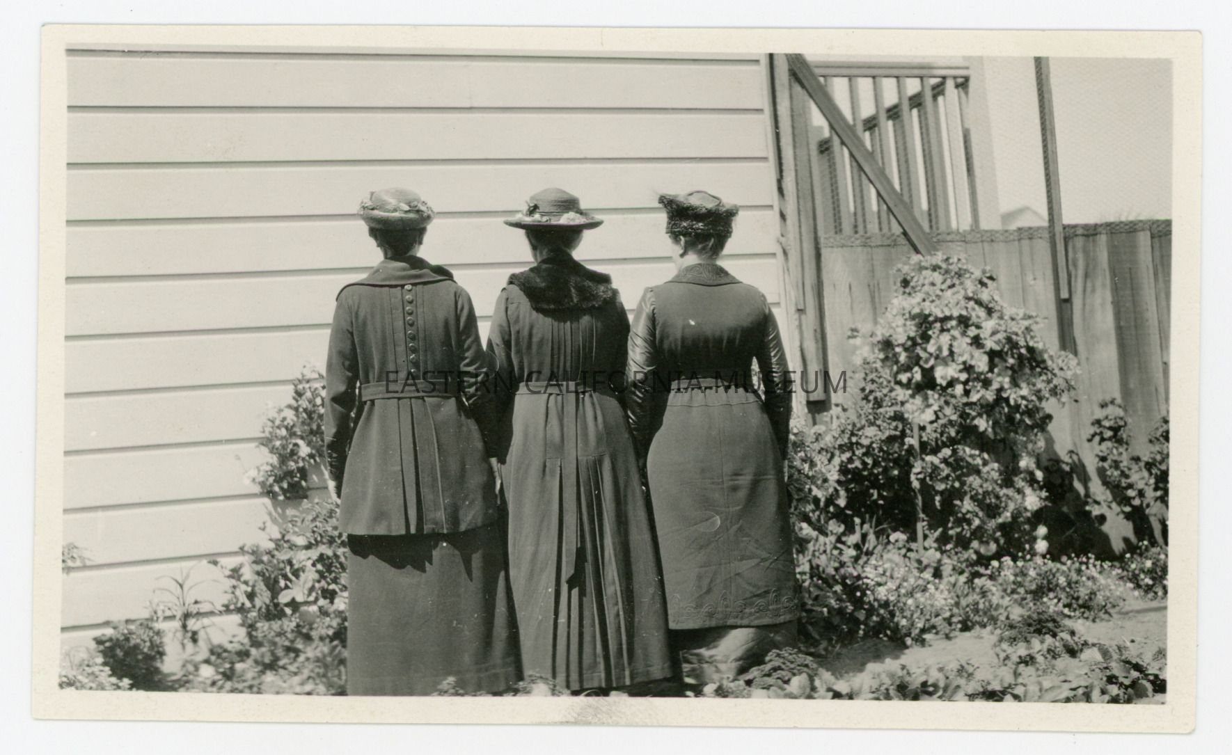 Exterior photo of three women in a garden with their backs to the camera. They are all wearing black clothing.