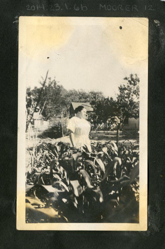 Woman in a white dress standing in a field of young corn with houses and buildings in the background.