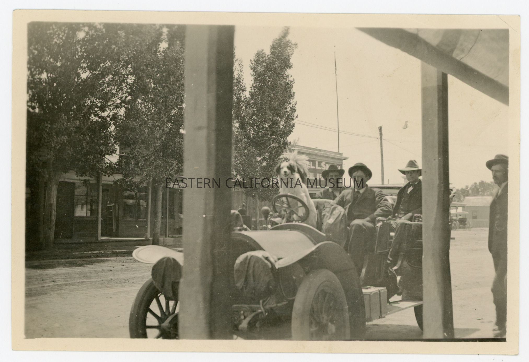 Exterior photo of three men and a dog sitting in an early vehicle parked along the side of a dirt street. It looks like they are parked along a main street of a town. There is a sign over a store in the background that says, "Will L. Smith General Merchandise."