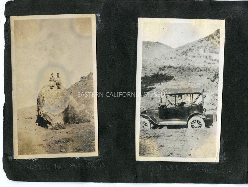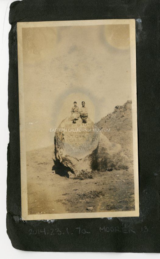 Two people (the one on the left is a girl, the other is a boy) sitting on top of a large rock that has a lot of writing on it (early advertisement?). Words that I can distinguish include "stop," "furniture," "stove," "cloth," and "sewing." Same event as MOORER 13, 23, and 34.Collection