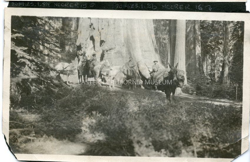 Four men mounted with at least seven horses/mules/burros/donkeys in front of a massive tree--probably a giant sequoia. The animals are well packed.Collection