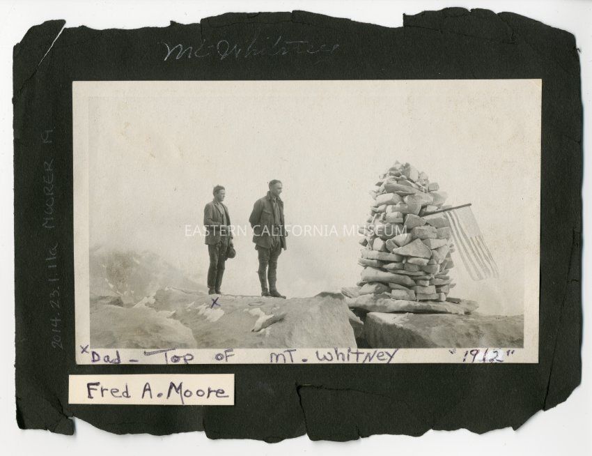 Photo is of Fred A. Moore (on the left holding his hat) standing on the summit of Mt. Whitney with another unidentified man. There is a large stone cairn with an American flag stuck in it. Photo is labeled, "Dad--Top of Mt. Whitney," "Fred A. Moore," "Mt. Whitney," and "1912."Collection