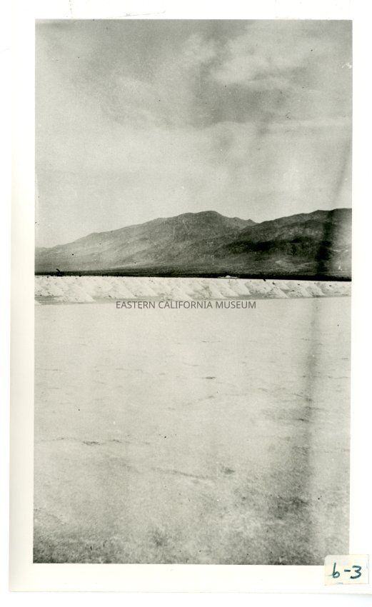 B/w photo of piles of salt with mountains in background.