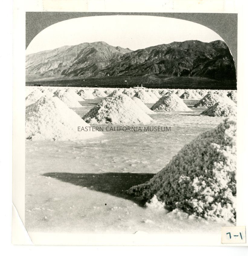 B/w photo of a close-up look at a pile of salt with mountains in the background. The picture seems to have rounded or arched top corners, like a stereoview.