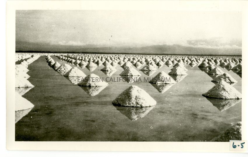 Label says: "Hundreds of piles of salt drying in Saline Valley. The salt was stacked in early springs and was dry and ready for shipment by mid-summer."