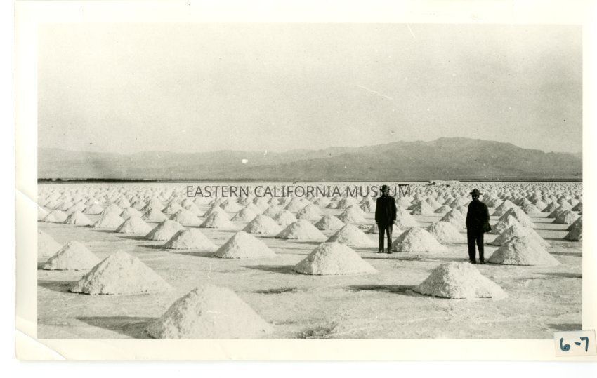 B/w photo of two men standing amongst rows of piles of salt with mountains in background.