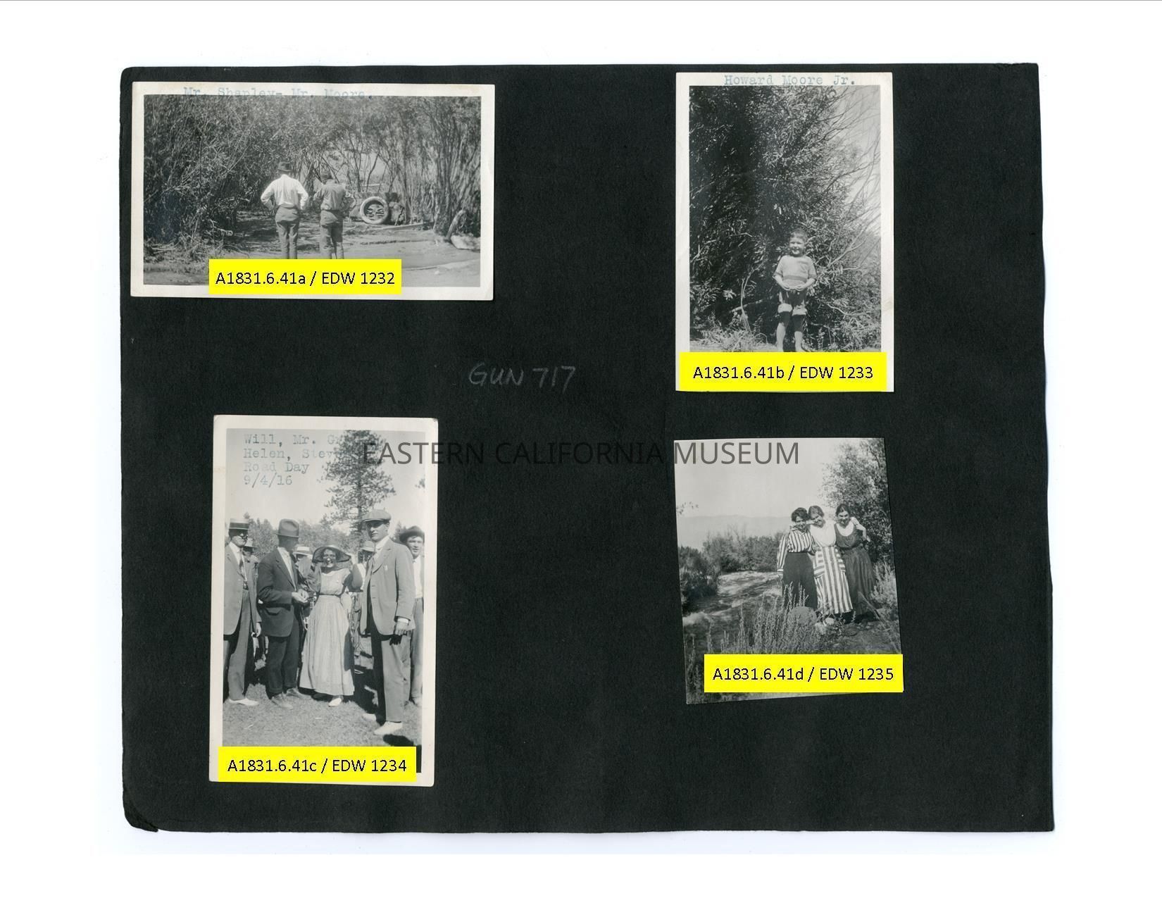 A1831.6.41c: Photo of a group of people with a woman in the center. Typewritten on top is, "WIll, Mr. Grant, Helen [Gunn], Stevens. Road Day, 9/4/16."