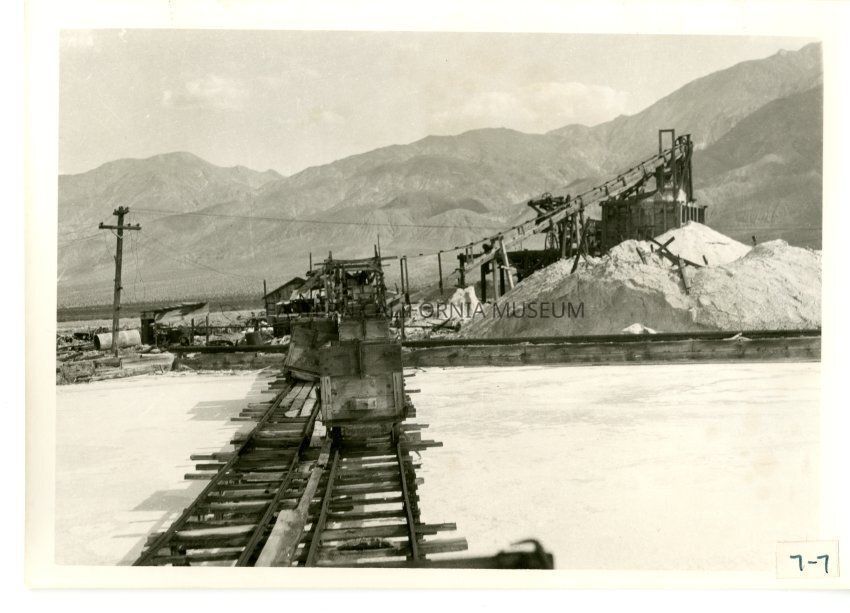 B/w photo of salt carts on rails going towards what appears to be a processing center or terminal. Huge piles of salt, power lines, mountains.