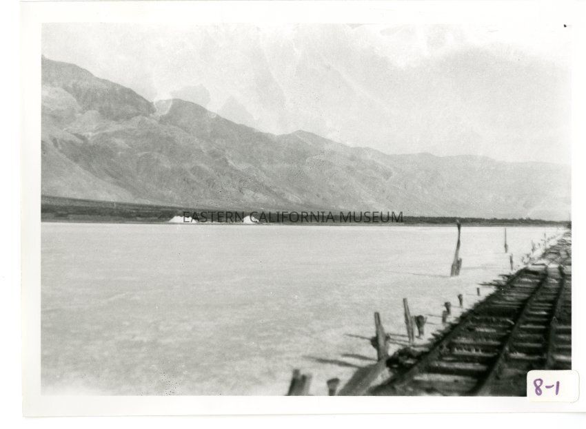 B/w photo of rails across salt flats with mountains in background.