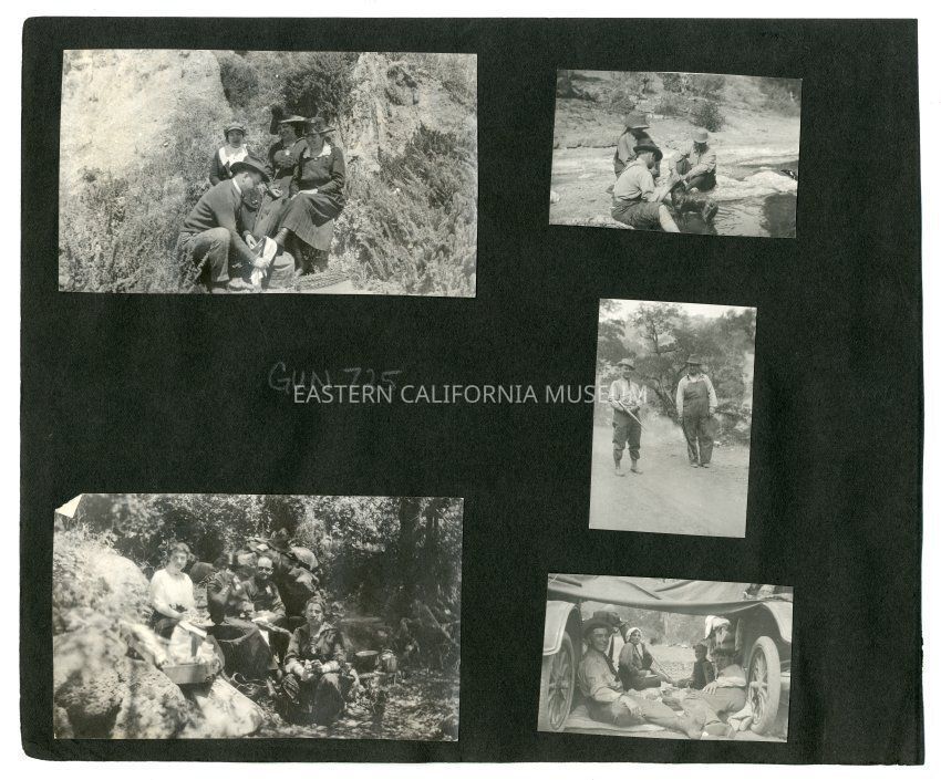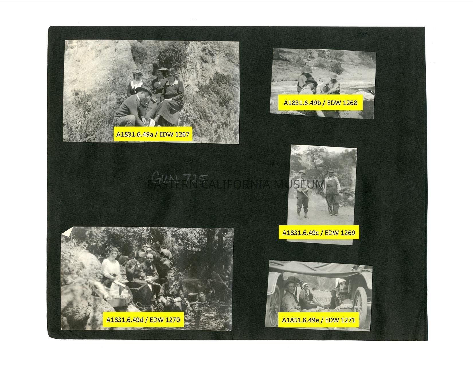 A1831.6.49e: Photo of four people (one women and one little boy) under a cover (tent?) stretched between two early vehicles.Collection