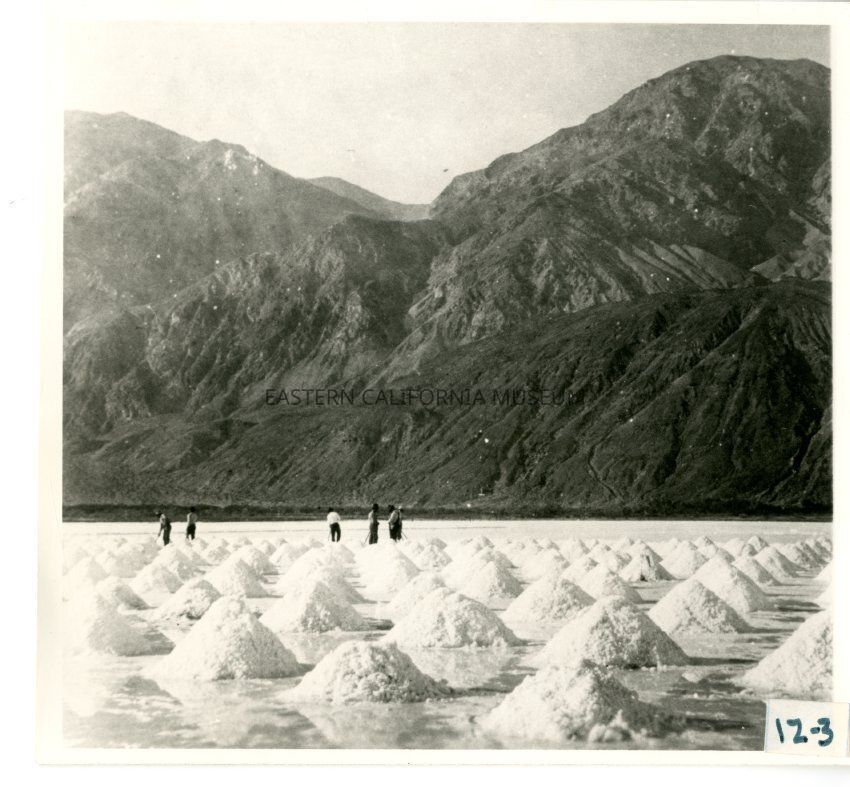 B/w photo of five men working amongst piles of salt with mountains in the background.