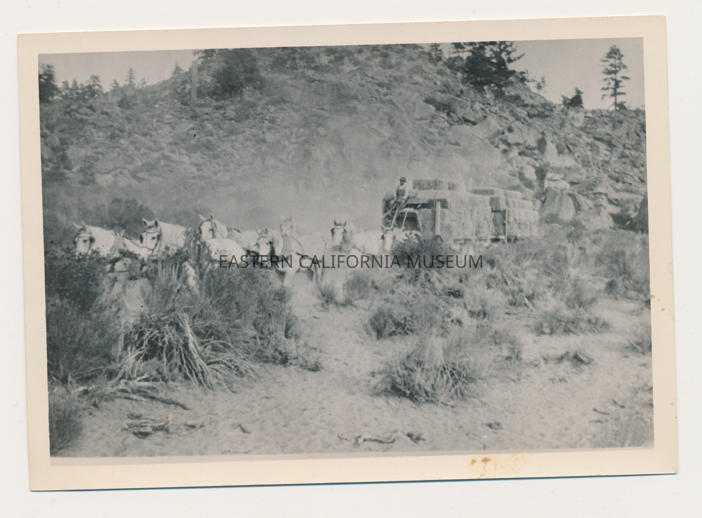 Photo of a man driving a team of eight white horses pulling a loaded hay wagon (two wagons?). The foreground is sandy with brush, and there is a hill with large rocks in the background.Collection