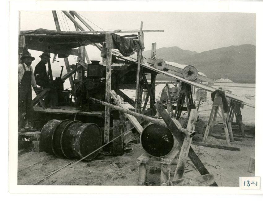 Label says: "View under the ramp wehre the salt buggies were dumped into salt cars. The buggy operator sits under a tarp with a loaded salt buggy being pulled up the unloading ramp. The tramline terminal is seen to the right of the salt buggy. Photo taken about 1913."