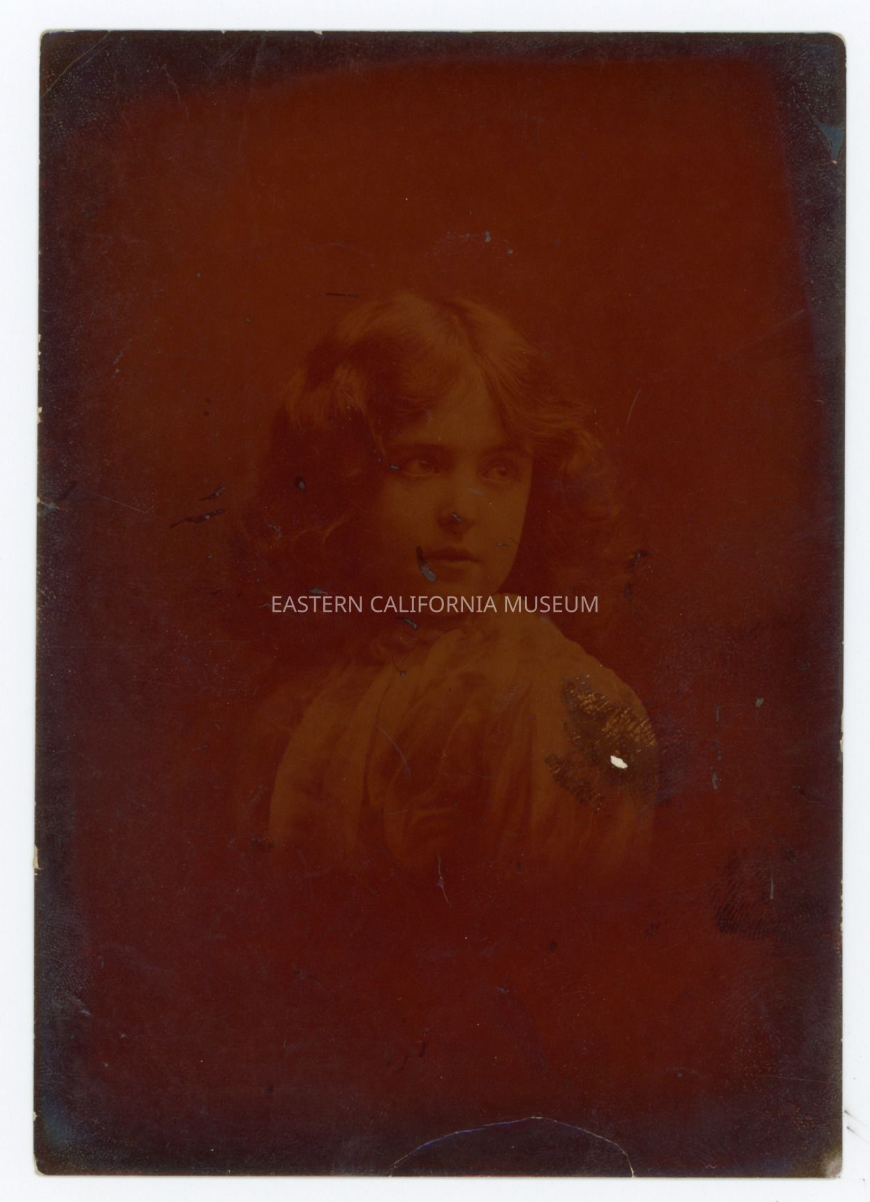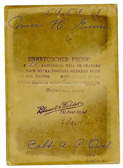 Severely darkened unretouched proof of a studio portrait of Helen Gunn as a young girl. Photographer was Blauert and Widder of San Francisco.Collection