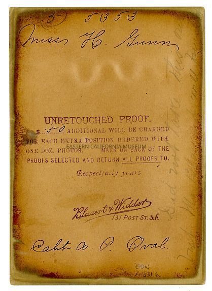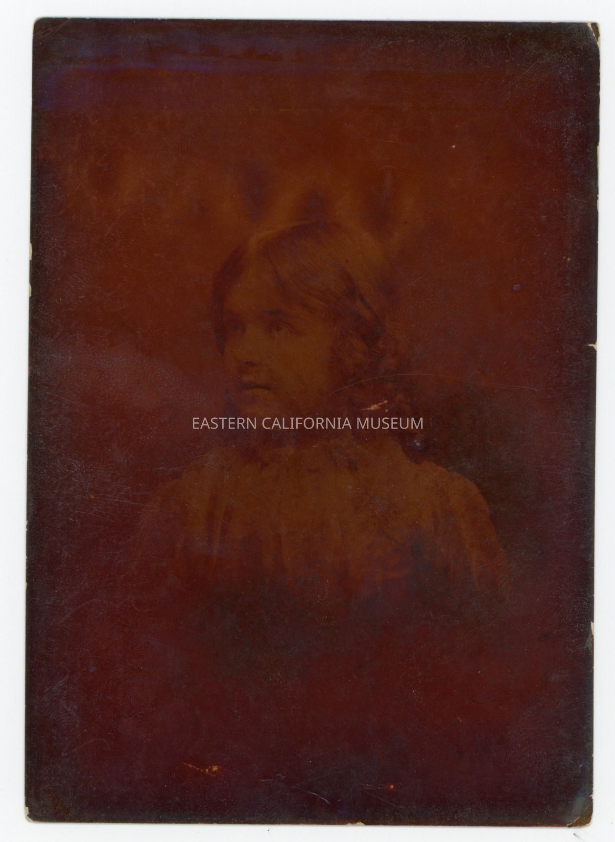 Severely darkened unretouched proof of a studio portrait of Helen Gunn as a young girl. Photographer was Blauert and Widder of San Francisco.Collection
