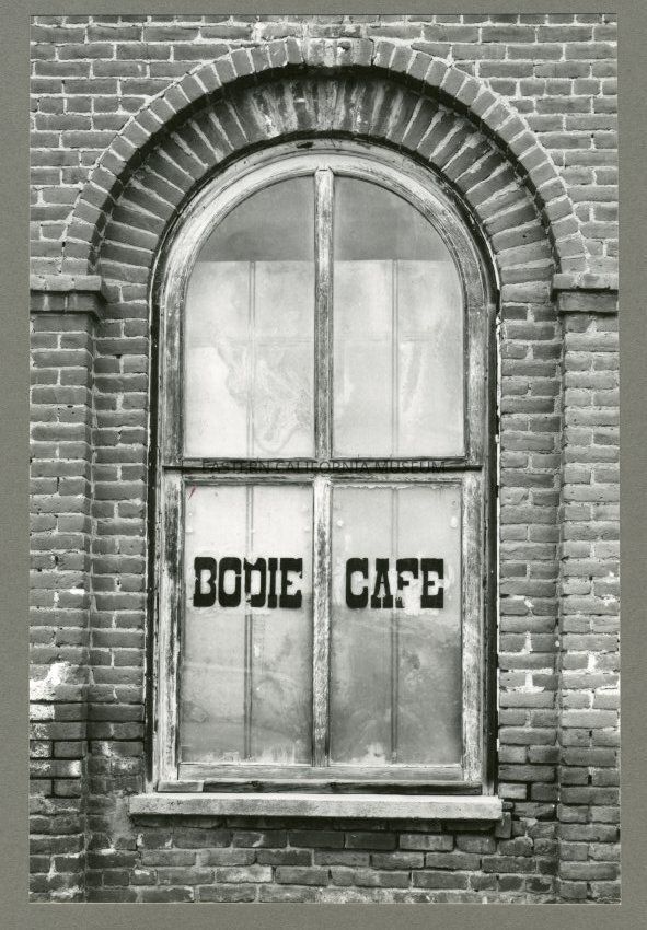 Mounted photo of an arched window in a brick building. Window has "Bodie Cafe" written on it.