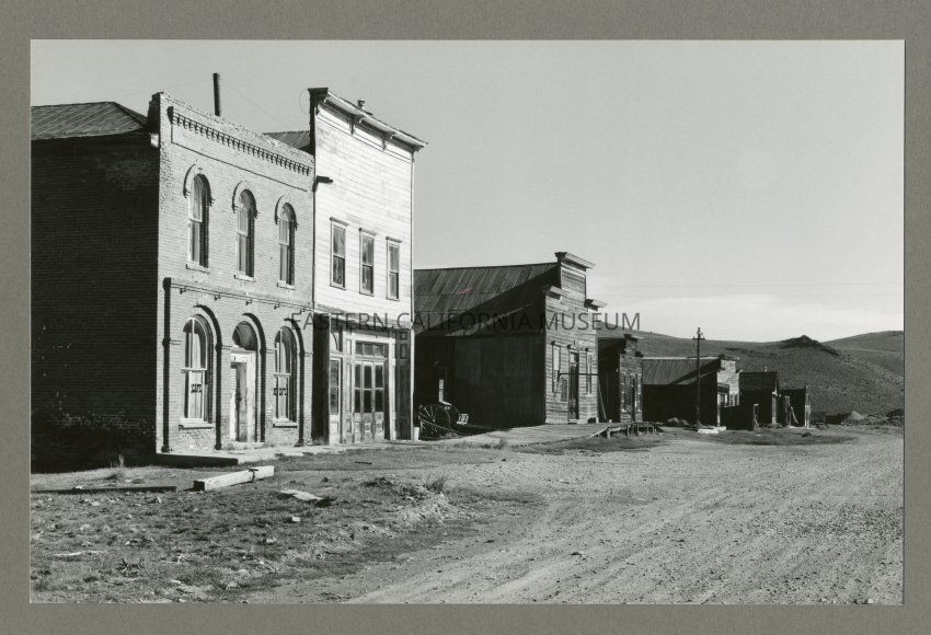 Mounted photo of Bodie. Row of structures, some brick and some wood. Street scene.