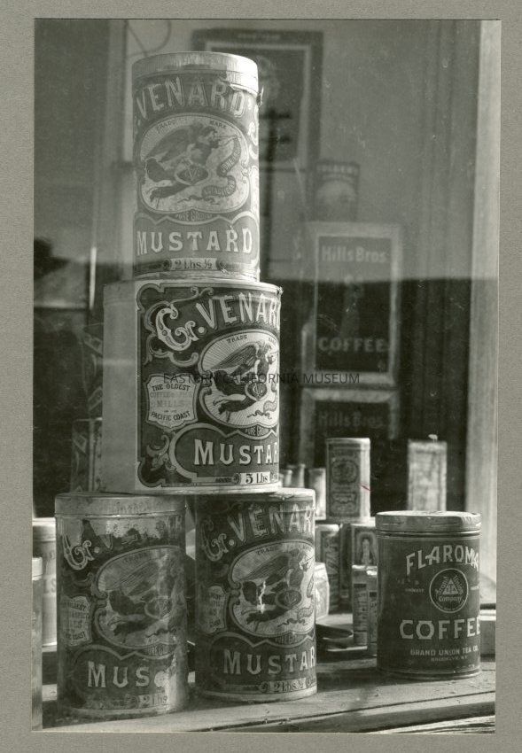 Mounted photo of stacked cans of mustard and coffee in a window at Bodie.