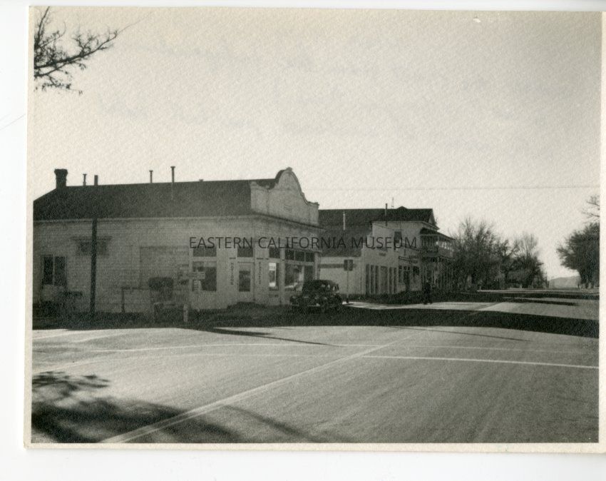 Photo of Edwards St./Highway 395 in Independence taken at the intersection with Market St./Onion Valley Rd. looking south. Rhine Store/Pines Cafe building, Hutchinson Service Storage warehouse, pool hall, hotel. Vehicle parked in front of buildings.