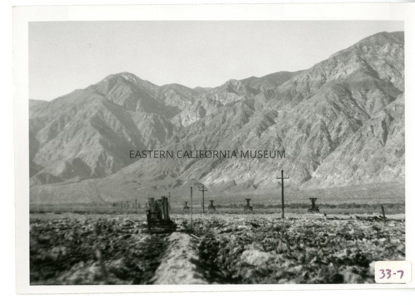 B/w photo of field (salt flats? windrows?) looking toward mountains. There are power lines, and also maybe trestles.