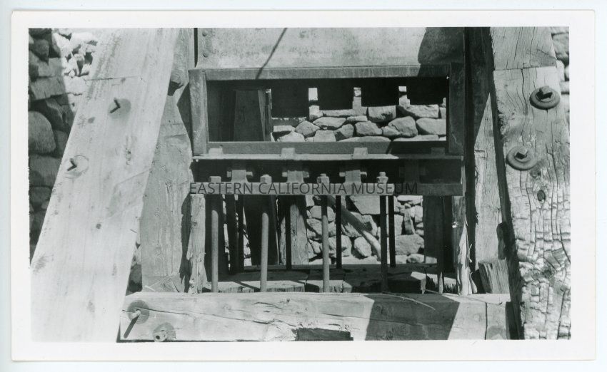 Black and white photograph of a wood beam and metal contraption likely used in mining or milling (stamp mill?). Rocks retaining wall visible in background.
