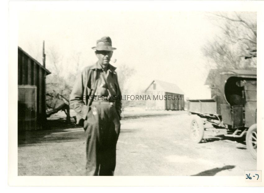 B/w photo of a man smoking a pipe. There is a vehicle to the right side of the photo, and two structures behind him (bunk houses?).