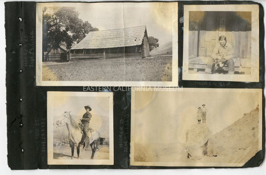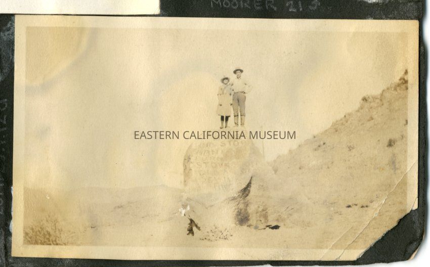 Faded photo of two people (a girl and a boy) standing on top of the rock with advertisements seen in MOORER 13, 23, and 34. Visible words include "bros," "stop," "furniture," and "sew."Collection