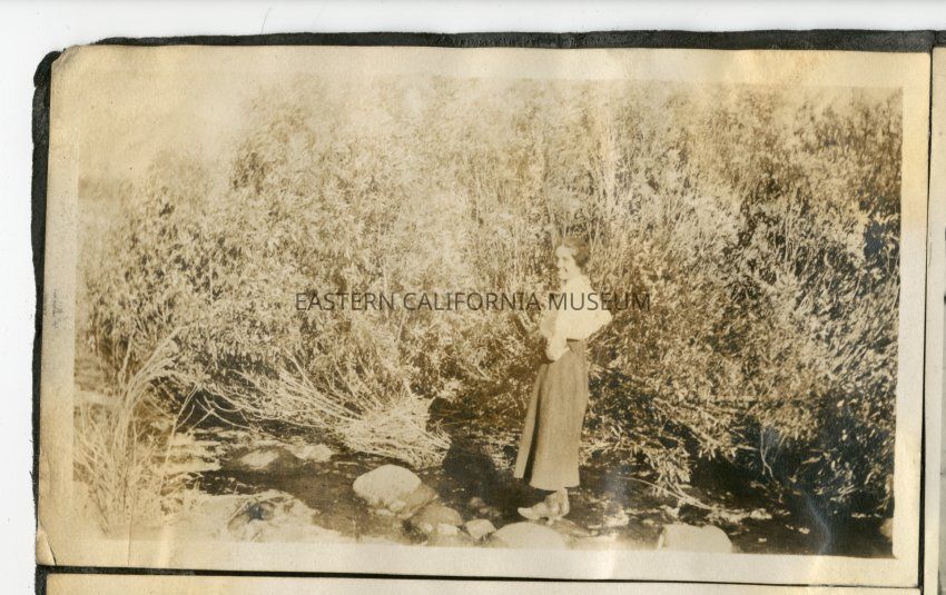 Faded photo of a woman turning and smiling at the photographer while standing on a rock on the edge or in the middle of a small creek. Tall brush behind her. Appears to be the same event as MOORER 24, 26, 28, 30, and 31.Collection