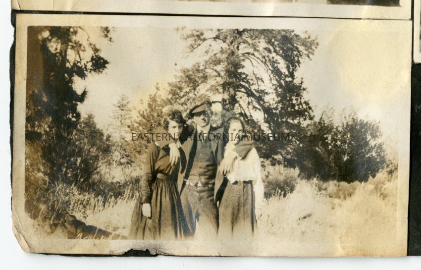 Faded photo of a man standing with is arms thrown around the shoulders of two women. Pine trees in background. Possibly the same man from MOORER 25 (nose looks the same, but different event/clothes). Appears to be the same event as MOORER 24, 26, 28, 30, and 31.Collection