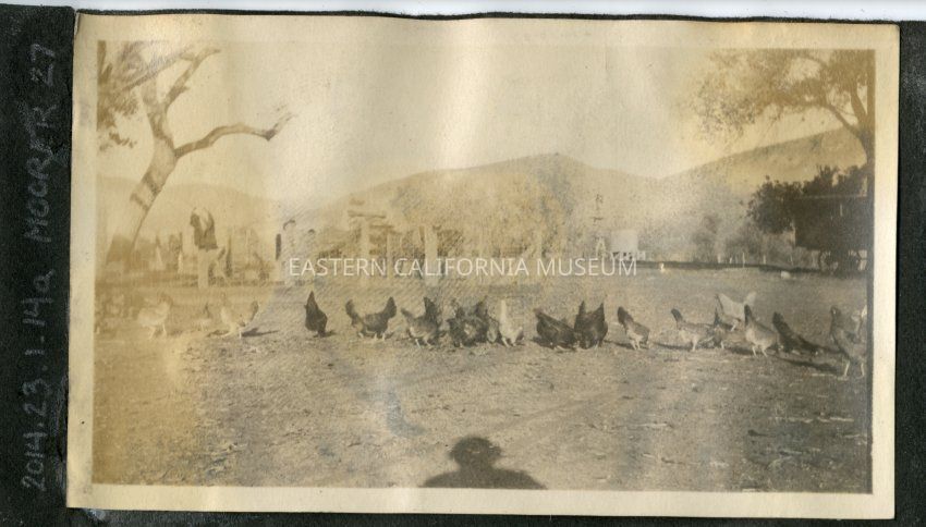 Faded photo (with fingerprint in the middle?) of a farm or ranch with lots of chickens in the foreground. Horse and wagon/buggy in center, water tank (?) and windmill in background. Might be people in the photo, but the damage makes it hard to tell for certain. The photographer's shadow is visible in the foreground.Collection
